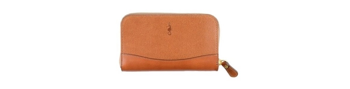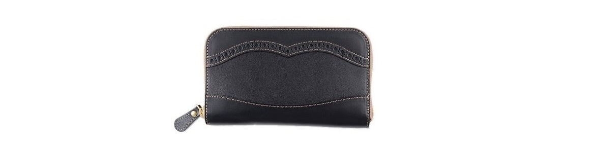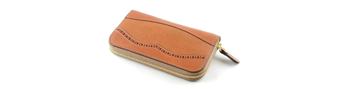 皮夾正面的飾紋讓人聯想到皮鞋的W型翼紋雕花,飾紋是由職人一個個雕孔排列而成。製品邊緣是採用所謂「切面」加工的製法,切面即為皮革的裁斷面,相較於採用「緣返」加工製法更為耐用。經年使用後,即使皮革邊緣磨損,也可視狀況進行修補。