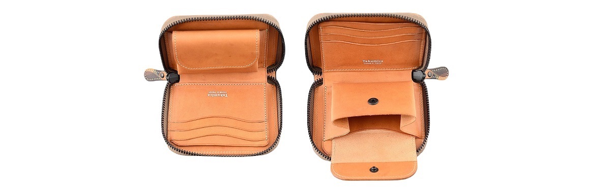 雖然小巧,但功能一樣不少。紙鈔夾層、壓釦式零錢袋,4個卡片夾層(其中一個位於零錢袋後方)集於一身。各卡片夾層上緣皆畫壓出邊線,呈現的精細輪廓與嚴謹意識,更隱含著職人手作的魅力 !內部的白色LOGO,這是由職人使用黃銅印章及專用機器,一個個手工細心地烙印而成。