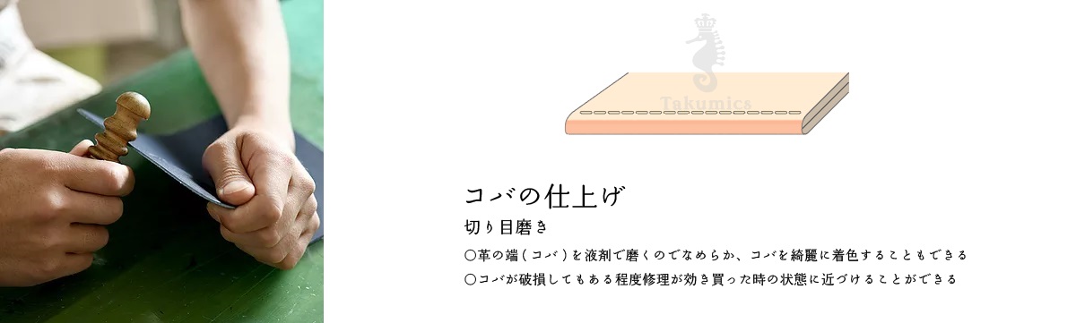 皮革裁斷面,在日本皮革工藝中以「コバ(KoBa)」稱呼之。皮革裁切後,裁切面會殘留皮革纖維而影響外觀美感 (如上圖_中),因此職人會施以特殊藥劑來研磨皮革裁切面,直到裁切面呈現圓滑狀態後(如上圖_上),再經過2道著色後才完成帶有光澤感的平滑邊緣(如上圖_下)。