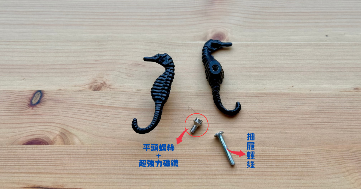 由於海馬造型把手的材質是鋅合金,無法直接吸附磁鐵。在保留未來仍可作為抽屜把手的功能下,於是想到可以鎖上平頭螺絲,然後於平頭螺絲上再固定一個超強力磁鐵。
