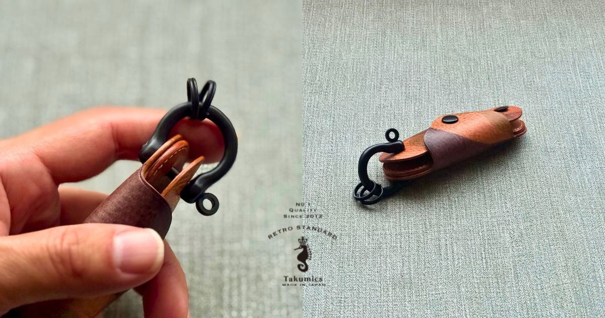 採用的是螺絲型「馬蹄形卸扣」,除了作為鑰匙包總和固定釦之外,也連接了鑰匙環以為備用。冷冽的金屬卸扣結合溫潤的義大利植鞣迷彩革,看似衝突,卻又完美地平衡兩種材質,推薦給也喜愛金屬工業風格的您。