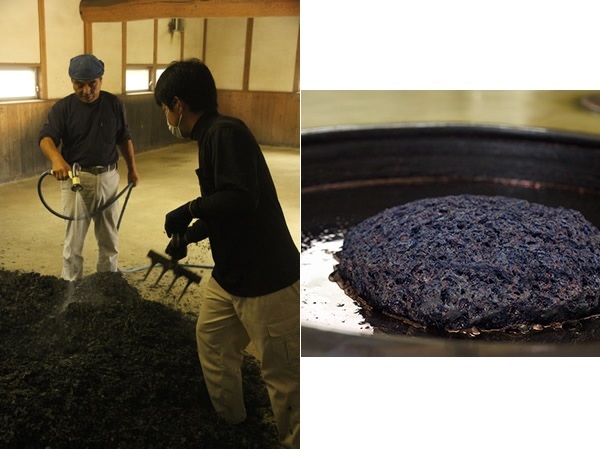 以德島縣的阿波藍為例,姑且不計蓼藍植物的養植時間(3月~7月),自7月開始收割整株的蓼藍,經過日曬乾燥後,將莖葉分離,製成「葉藍(はあい)」,再經過約100天的發酵作業。在這段發酵期間,每4~5天需要澆水於「葉藍」並充分混合,再堆積發酵(如上右圖),反覆此作業直到12月才製成「蒅 (スクモ)」的天然染料。