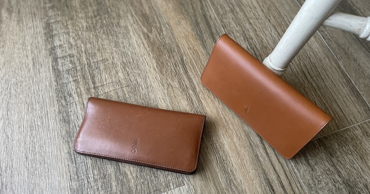此外,指甲輕輕一刮就很容易在植鞣革的皮面上產生刮痕,在使用植鞣革所製成的皮件時要特別留意的這點。但從另一角度來看,經過一段時間使用後,植鞣皮革物件會隨著每個人的使用習慣而增添使用痕跡,於是養成了自我風格的獨特韻味。此皮革養成經歷就稱為「經年變化」或「陳化」。每日陪伴自己的皮革物件上,新舊刻痕、斑駁印記,或是漸增的光澤感,逐一承載著自己的生活歷程,這也是讓人喜愛上皮革物件的原因。(左: Dodici長夾_棕色_使用歷時 1 年 1 個月 ; 右: 新品)